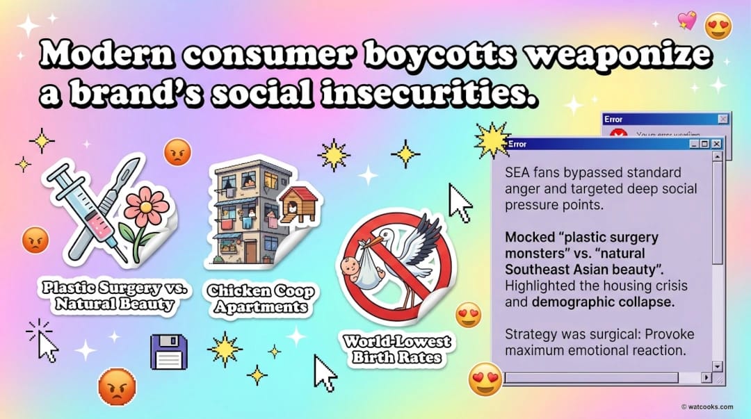They didnāt just post angry replies. They identified South Koreaās specific social pressure points and attacked those directly.Ā